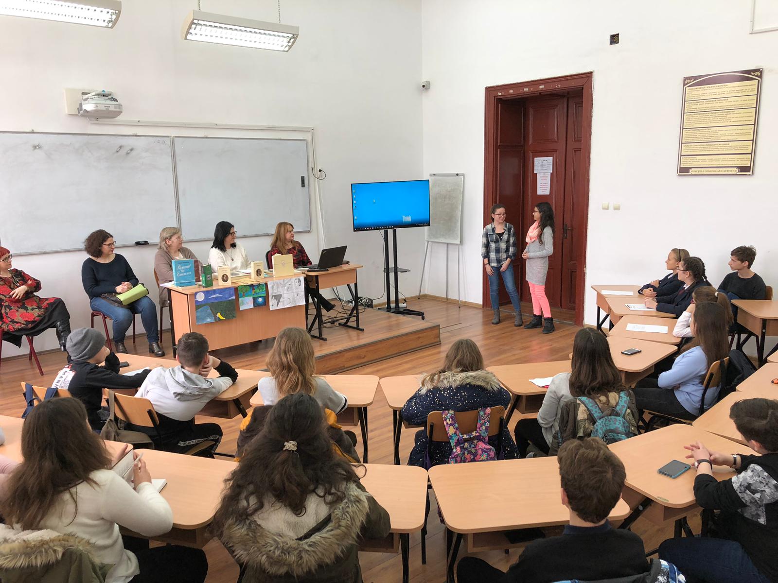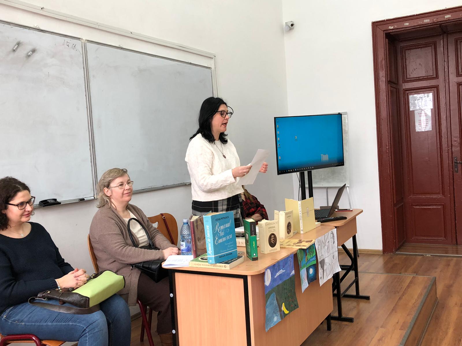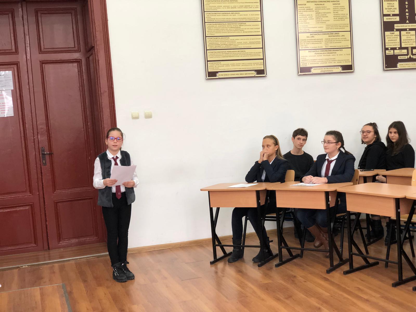 Bineînțeles că din acest moment omagial nu au lipsit recitările de versuri și transpuneri ale unor creații eminesciene în limbaj plastic sau muzical. Doamna director adjunct, prof. Laura Putnic, a acceptat provocarea de a le recita elevilor o poezie a lui Eminescu tradusă în limba franceză. Elevii au înțeles astfel că ecourile creației poetului nostru național au depășit hotarele țării, iar Eminescu este o personalitate care a făcut cunoscut în lumea întreagă specificul sensibilității românești.